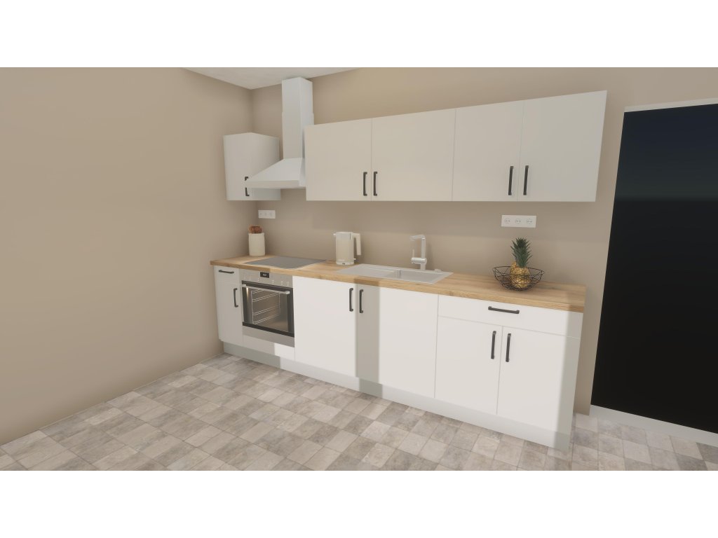 Rovná kuchyně v základní výbavě s již smontovanými skříňkami z výroby. Dodáváno bez spotřebičů, dřezu, baterie a dalšího vybavení.